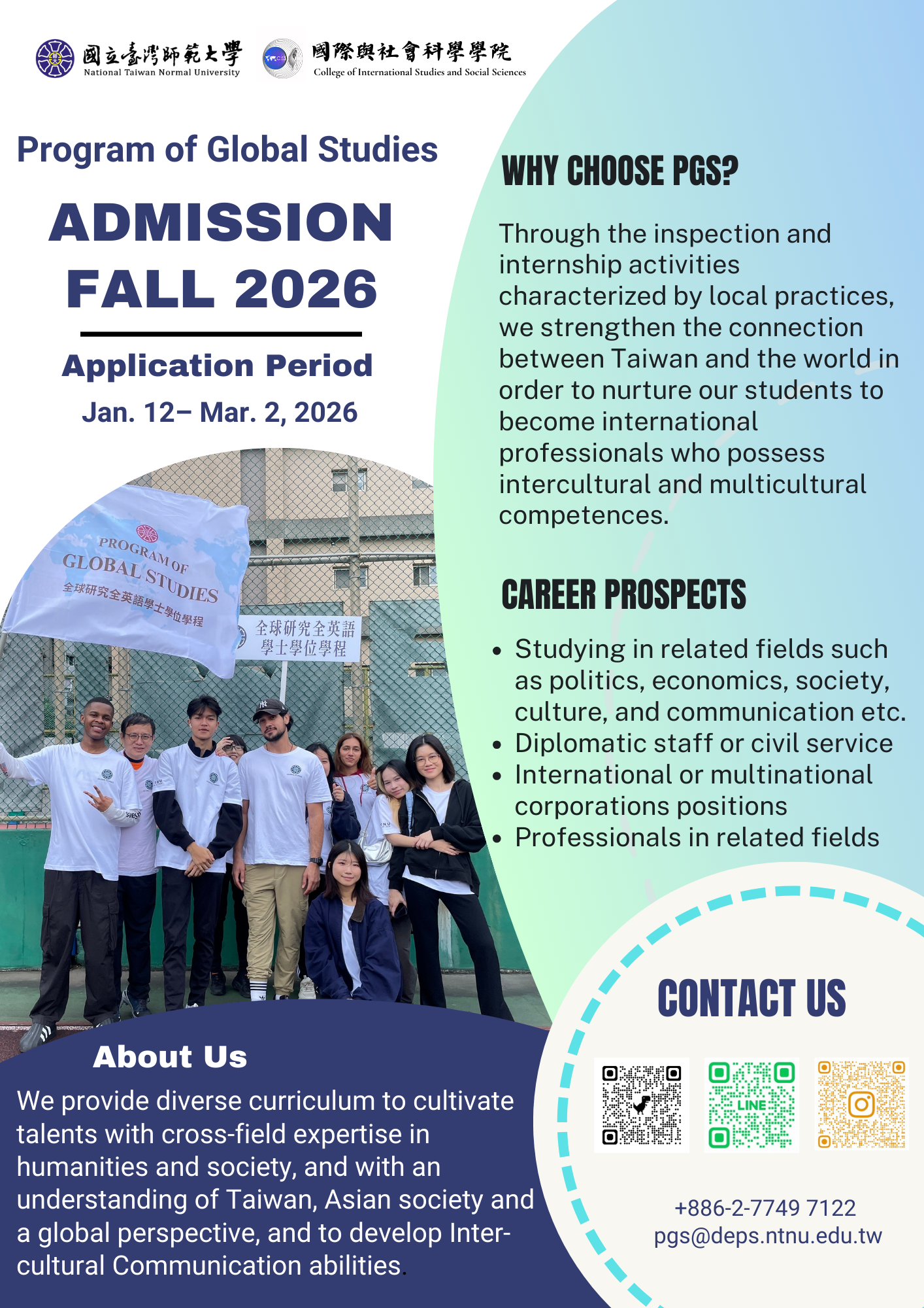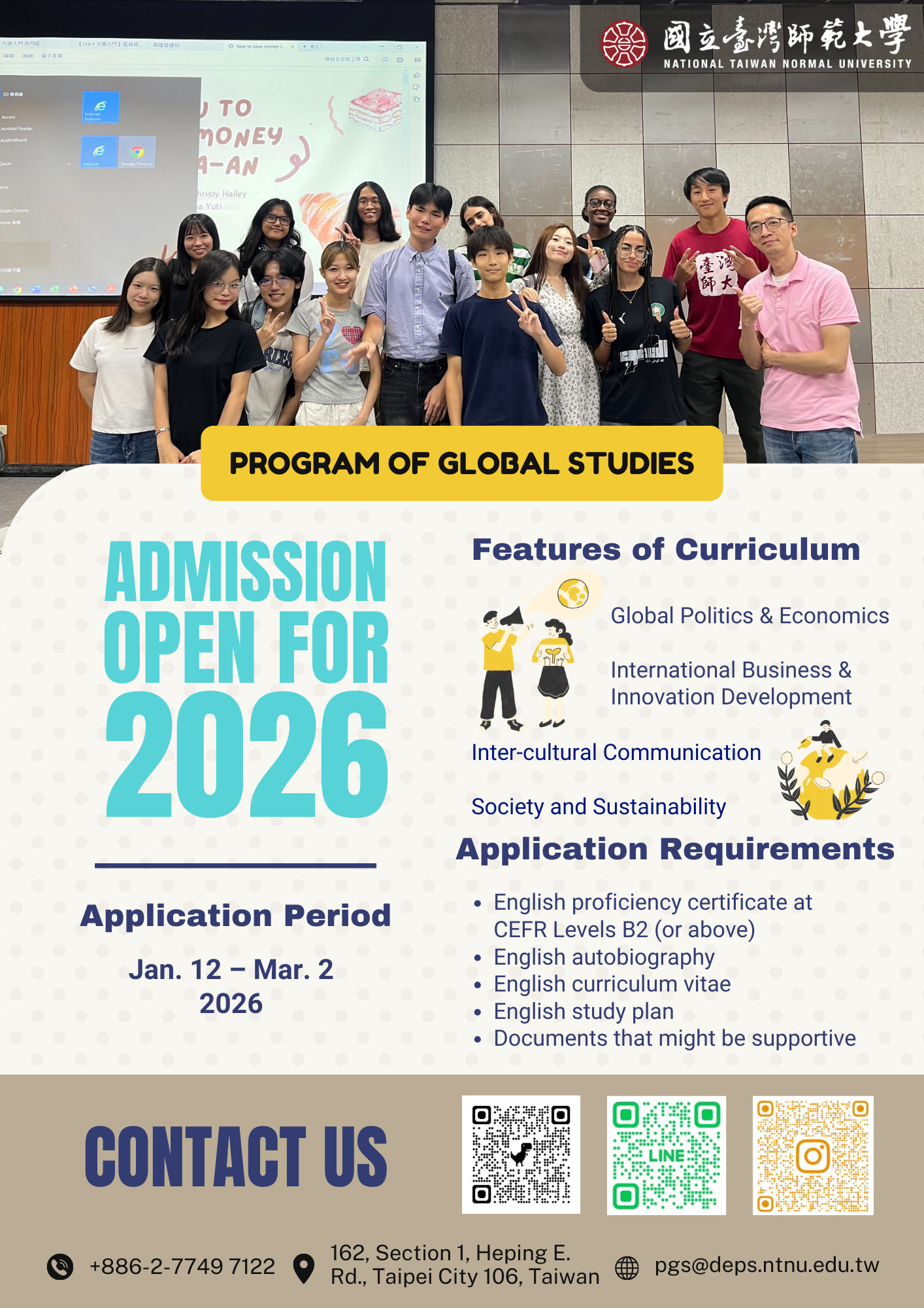 | 招生資訊 |秋季申請 線上申請:https://bds.oia.ntnu.edu.tw/bds/en/apply |如何申請 甄審項目 語言能力證明要求 規定資料 獎學金 甄審項目 書面審查,總成績占比: 100% 語言能力證明要求 英文能力要求:英文能力測驗相當於歐洲語言共同參考架構(CEFR)等級 – B2國籍為英語系國家之申請者免繳 (需提供證明)在英語系國家取得前一學位之申請者免繳 (需提供證明) 規定資料 歐洲語言共同參考架構(CEFR)等級 B2以上(含B2)之英語能力證明英文自傳英文個人學經歷英文讀書計畫其他有利審查之資料 獎學金 國立臺灣師範大學提供各式獎學金給國際生,詳情請洽國際事務處網站: https://bds.oia.ntnu.edu.tw/bds/en/web/scholarship